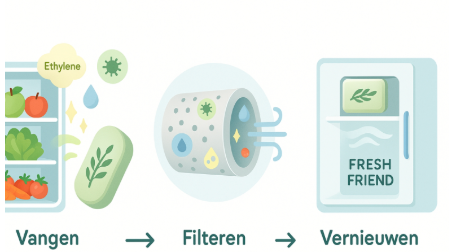 Door microscopisch kleine poriën blijven de slechte deeltjes en bacteriën vastzitten, terwijl schone lucht terug de koelkast in gaat.